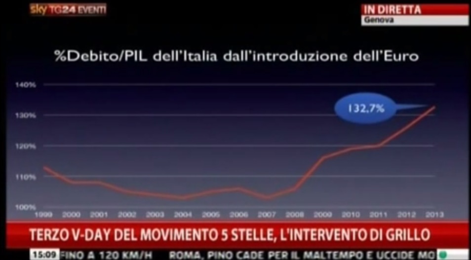 Negli scorsi giorni mi é capitato di vedere il comizio di Beppe Grillo al V-Day 3 di Genova e la mia attenzione é immediatamente andata sulla parte anti-Euro. Vecchi discorsi sugli effetti negativi dell’Euro giá sentiti da un po’ tutto il jet set politico Italiano ma in questo caso sono stati mostrati dei grafici che falsano la realtá e attribuiscono alla moneta unica colpe che non ha. L’Euro é sicuramente una gabbia monetaria imperfetta ma certo non si porta dietro le colpe della disastrata situazione dei conti pubblici Italiani.