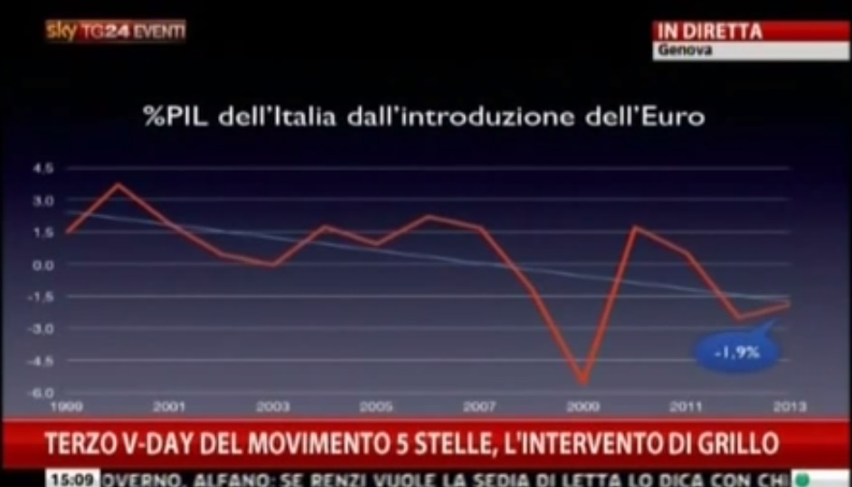 Secondo Grillo questo é l’andamento del PIL dopo l’Euro e il grafico é chiamato “% PIL dell’Italia dall’introduzione dell’Euro”. Non é ben chiaro cosa si intende ma a vedere i valori direi che é la variazione annuale percentuale del PIL.