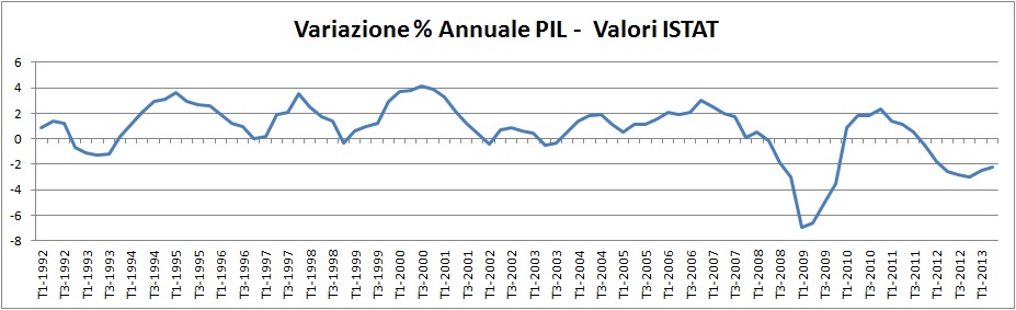 Invece questa é la serie storica dal 1992 al 2013 fornita dall’ISTAT della stessa misura da cui ho estratto il grafico qui sotto.