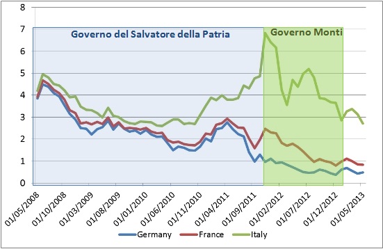 In ogni caso questo grafico rappresenta gli interessi sui Titoli di stato a 5 anni dei tre maggiori paesi Europei: Francia, Germania e Italia (periodo 2008 – 2013). Considerando che se gli interessi aumentano il nostro debito pubblico aumenta e gli Italiani devono pagare con le tasse forse non abbiamo molti motivi per ringraziare l’operato del Governo che ha ricostruito l’Aquila in un mese.