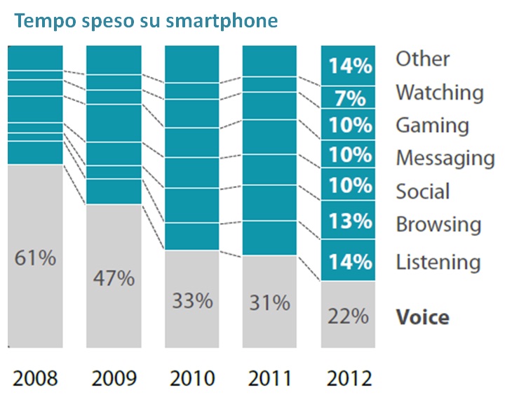 In aggiunta il tempo di utilizzo degli Smartphone é cosí distribuito fra le seguenti applicazioni.