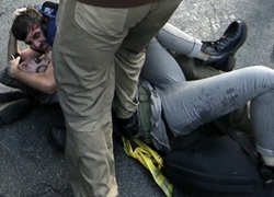 La 22enne Deborah Angrisani passata alle cronache per essere stata calpestata da un poliziotto mentre un suo amico faceva da scudo umano sul suo corpo (foto sotto).