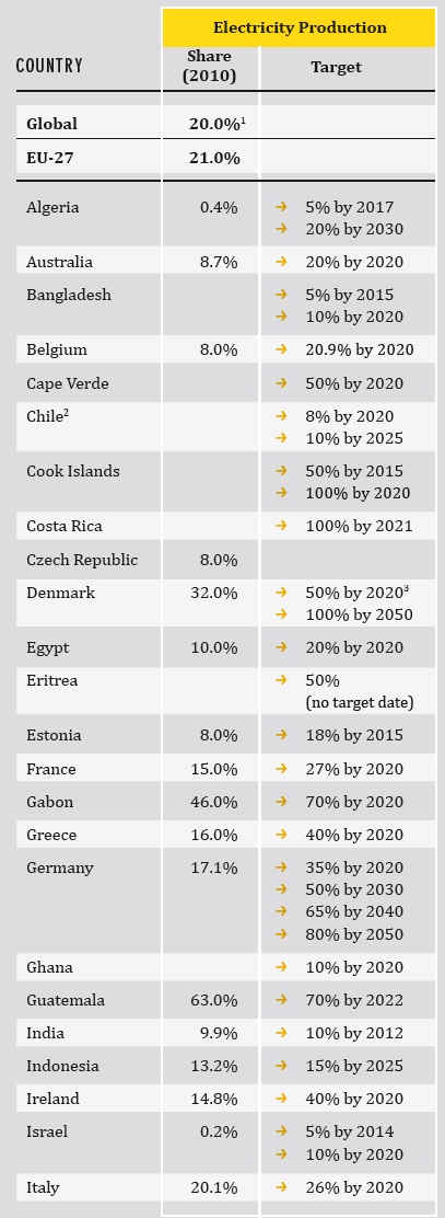Un ultimo dato al contorno per far capire quali sono le visioni a lungo termine della nostra classe politica. Queste sono le attuali situazioni in termini di produzione elettrica da energie rinnovabili e a fianco i piani energetici nazionali dei diversi paesi per i prossimi decenni.